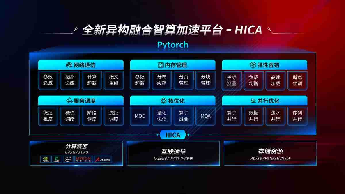 通过自研的服务层、、中间适配层、、、以及调度编排算法,,采用数据并行、、、、模型并行等多种并行方式,,把并行计算任务进行有效的分解,,使其分别由相应的软件栈和算力资源来承接。。。。当GPU资源变化,,,HICA可以实时动态调度计算子任务并调整模型拓扑和架构,,,以充分聚合各种算力资源。。