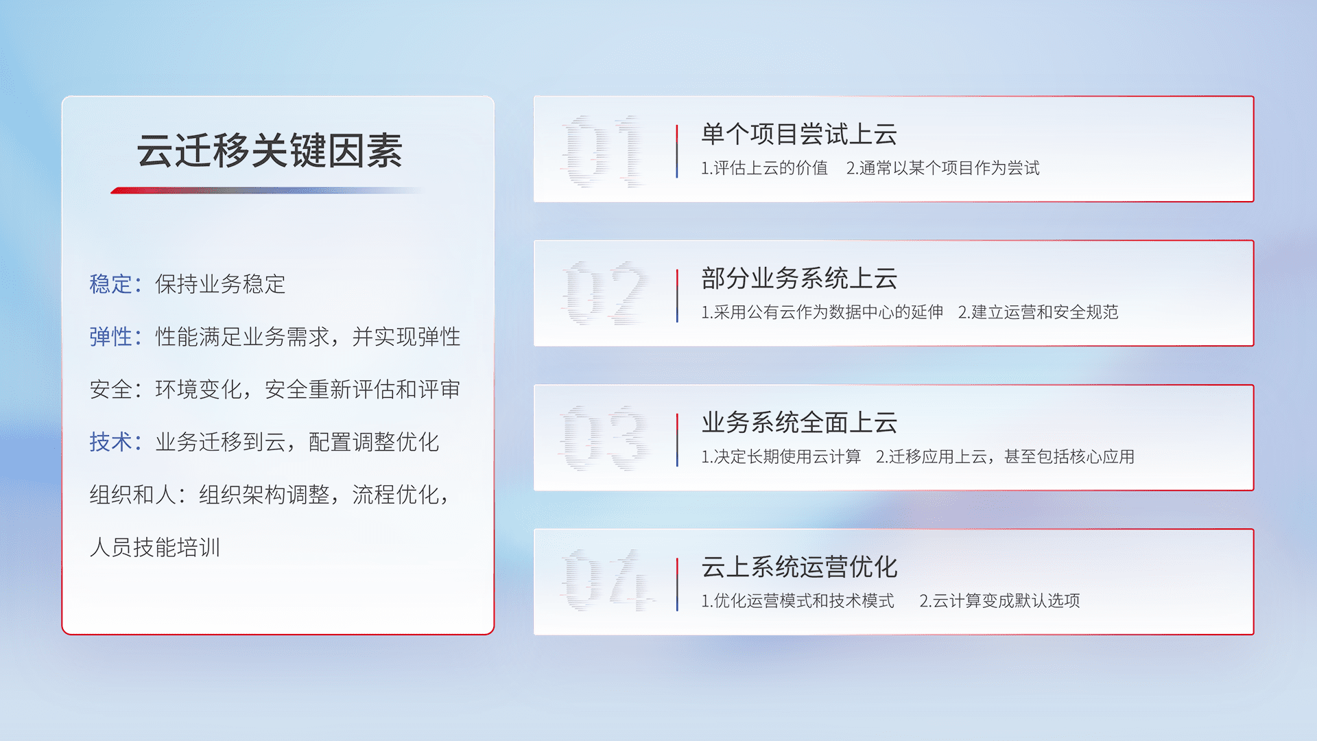 结合实际业务,,,,从规划设计、、、云平台选型、、、云原生改造、、数据迁移、、、、集成交付,,迁移全过程为客户识别最佳上云路径,,做好风险识别管理,,,设计网络架构、、、身份权限、、、、安全审计合规、、操作审计、、、、日志审计、、监控告警策略、、多站点容灾设计等,,,对云上基础设施进行整体规划,,,,提升IT治理水平,,,,以满足弹性、、、高可用、、、、高性能的需求。。。