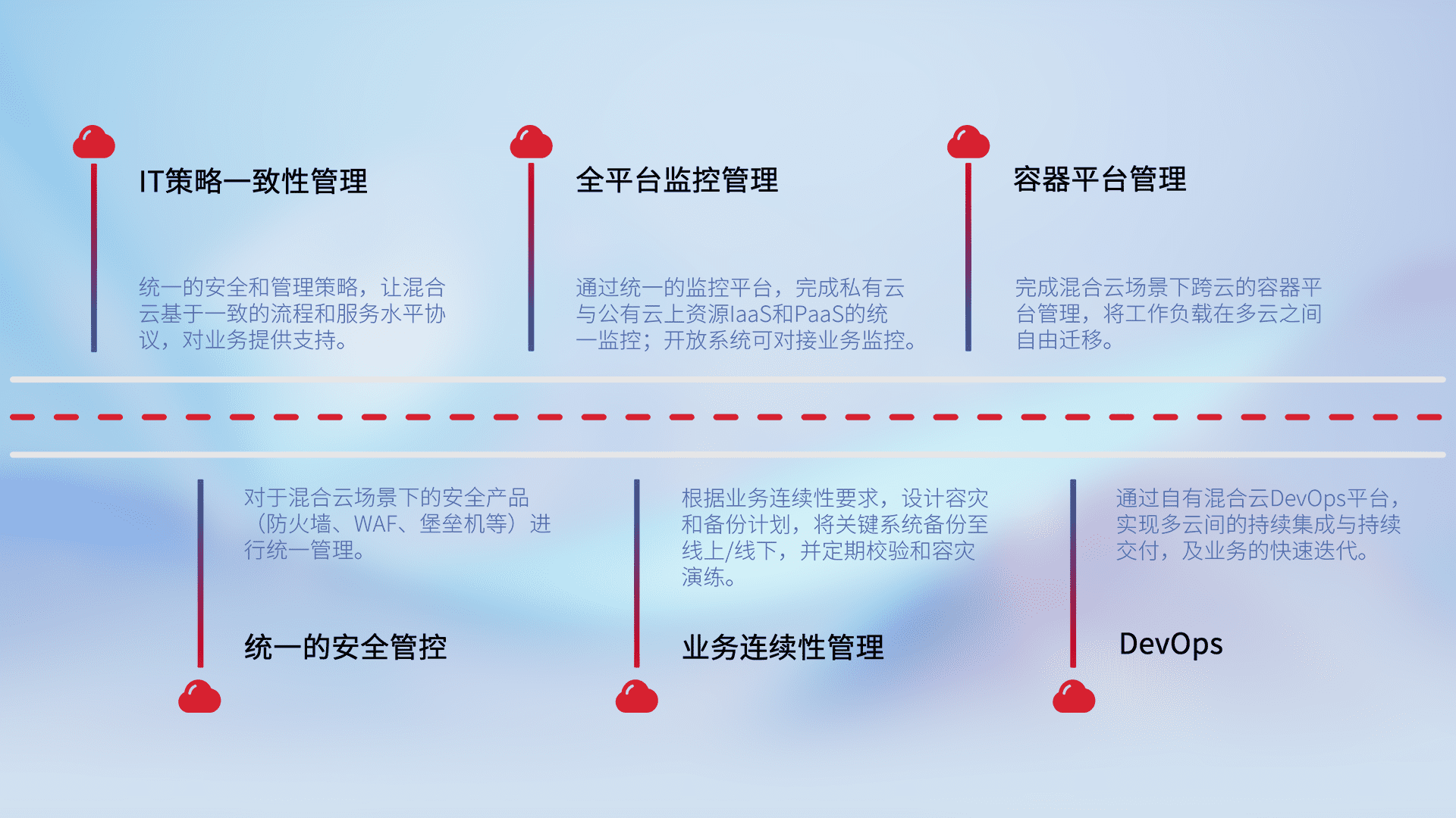 通过多云纳管,,,以统一的资源数据模型把客户的云资源进行抽象和封装,,,,进而实现对多云资源的统一操作,,,,保障云资源管理的可靠性、、、、稳定性与可用性。。。。量身定制化运维内容,,,配置、、开发运维、、、补丁管理、、、备份、、、监控、、认证和访问管理、、审计和日常巡检等,,,保障在用云过程中的可靠度,,稳定度以及高可用率。。。。